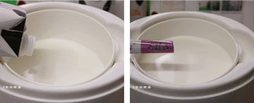 2、倒入纯牛奶,白糖、倒入1小袋普泽酸奶发酵剂。