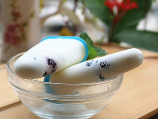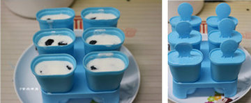 6、模具内先倒入少量酸奶,再放入洗过的葡萄干(每个模具内放10粒左右),继续注满酸奶,插上雪糕柄,放入冰箱冷冻格冷冻10小时左右即可。