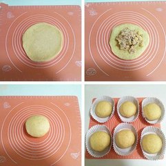 9、面皮中间放入适量的金枪鱼馅料,如果金枪鱼里的水分或橄榄油没有沥干当收口的时候就不好捏紧了,所以尽量把多余的橄榄油沥干。