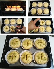 14、用剪刀在面包的表面剪个十字,如果要好看的就要把表面的面皮剪开能够看见金枪鱼馅料。