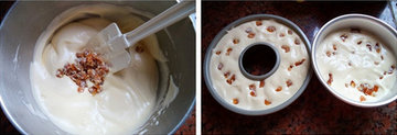 14、把拌匀的面糊倒入模具中,震出大气泡。