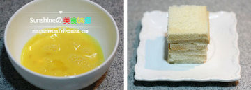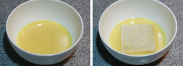 6、将吐司片放入蛋液中,均匀浸满蛋液。