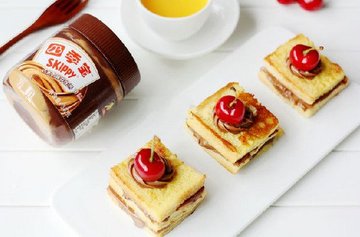 8、烤好的吐司片上抹上花生酱,按自己喜好的层数叠加起来,最后在上面挤上花生酱,再放上樱桃即可。