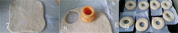 8、用甜甜圈模具压出圆环形成为甜甜圈生胚。面团边角重新揉成团在擀开压出圆形,反复操作。