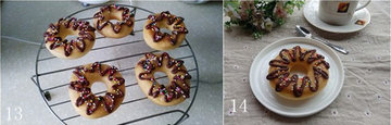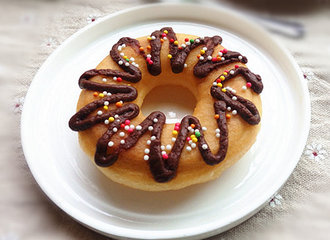 13、巧克力酱装入裱花袋,剪开小口,挤在甜甜圈上,撒彩珠糖装饰即成。