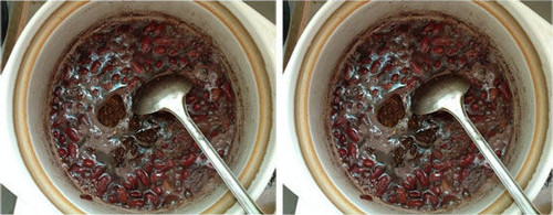3、但是不要立即舀出,用锅子的余温在慢慢的熬煮这样糖会入味。由于豆子的甜味十足不用再加糖。