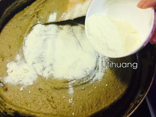 3、B材料奶粉撒一半到已将奶油砂糖都吸收的绿豆泥,炒均匀边用小火收干。