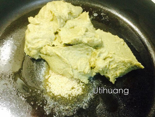 2、(打好的绿豆泥如图,不会太湿)材料B将无盐奶油置入刚开火的锅,融化至液态关火再放砂糖绿豆泥稍加拌匀,开中小火将糖及奶油都加热不断搅拌融入绿豆泥。
