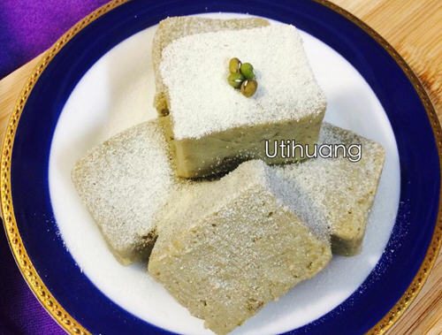 6、接着入冷藏1-2小时,或冷冻30分钟有较硬就可以切来食用了!200g绿豆泥炒好入保鲜膜盒长方体每个切约1.5cm,约可切20个左右。
