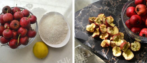 材料:新鲜山楂500克、糖250克、纯净水200克、柠檬一粒