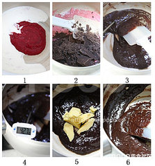 12、树莓巧克力甘纳许做法:淡奶油和25克树莓果泥混合倒入锅中煮至略沸。