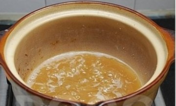4、然后用漏勺捞起梨蓉用另一只汤匙按压,挤出更多梨汁;将挤压后的梨渣红枣和姜丝扔掉,锅内只留下梨汁,继续用最小火熬煮约1小时,至梨浆浓稠后熄火放凉;在放凉后的梨浆里调入蜂蜜拌匀,然后放入密封罐保存即可。