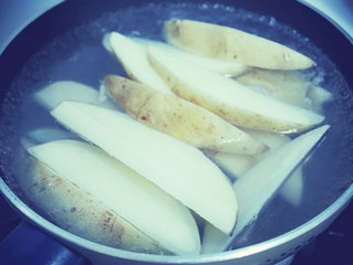 1、马铃薯洗干净不需去皮,切成半月形!将马铃薯放入滚水中约煮3分钟捞起。
