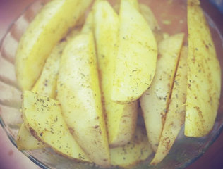 2、马铃薯.橄榄油.咖哩粉及香芹粉一起放在容器里抓一抓!!! 放入预热200度烤箱烤约10-15分钟即完成。