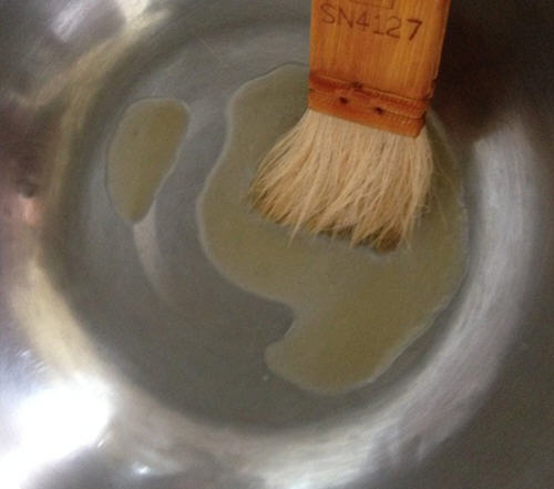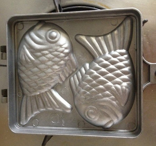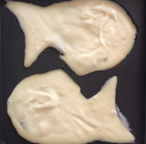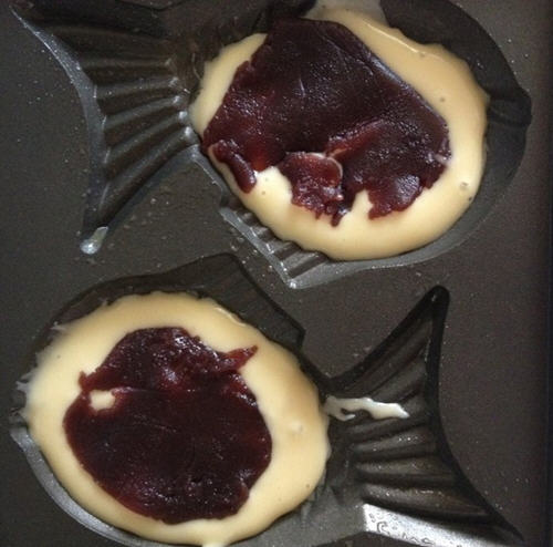 4、鲷鱼烧的模子加热,用毛刷抹上少许的黄油,面糊放入裱花袋,挤入模具体积的的一半面糊,放入红豆沙,再挤上一些面糊盖住豆沙。