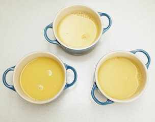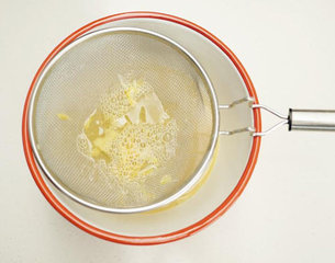 2、把蛋液倒入容器中并用滤网滤掉杂质和气泡。