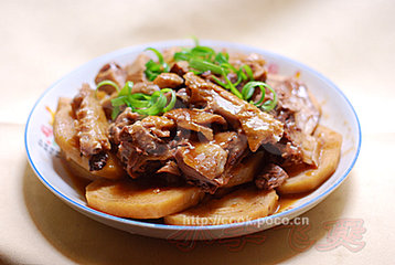 4、另起锅放油将切好的葛略炒后加入清水,再放入煎过的鹅,加生抽、老抽和白糖,加盖芍邻藕蠓叛蔚魑丁=葛铺在碟底,鹅斩件铺上面,再淋上原汁便可。