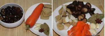 配料:胡萝卜:1根,八角:1个,大蒜子:2瓣,香叶:适量,香菇:适量,料酒:少许,生抽 :少许,老抽:少许,油:适量,鸡精:少许,葱段:适量,盐:适量