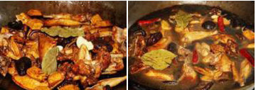 4、倒入少许料酒和老抽、生抽,翻炒上色均匀,往里放香叶、八角、大蒜子等,再倒入适量水,约没过鹌鹑。