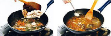5 、在锅内加入高汤(或水),改大火将汤煮沸,再分别放入青豆、泡发的黄花菜、泡发的木耳和油滑过的里脊肉片。