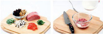 主料:里脊肉200g,蒜苗100g,平菇100g,青豆约50g,香菜2根,西红柿约150g,干黄花菜约15g,干木耳约15g,蛋清1只