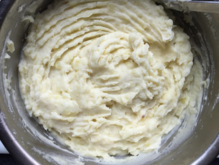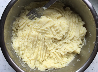 1、马铃薯去皮蒸熟压成泥,趁热拌进奶油,并加入适量盐及胡椒