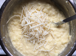 4 、将马铃薯泥填入烤盘,撒上另一半帕马森起司,送入预热至170度的烤箱烤约20分钟至表面金黄即可