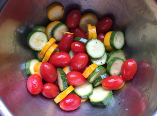 5 、黄绿栉瓜切片,连同小番茄放锅内,加入适量橄榄油,盐及胡椒拌匀