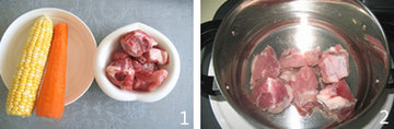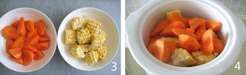 4、电炖盅内加入焯过水的排骨,胡萝卜及玉米,加入几片姜片。