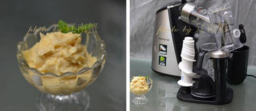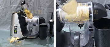 4、启动机器,冰爽的果泥出就出来。拍这张图的时候我有些失望,为什么那么多果肉都不进去呢,后来才发现,是榴莲核没有取干净,所以才没有完全进入。正常情况下,只要水果冰冻到位,机器部件冷藏到位,出果泥的情况会很不错的。