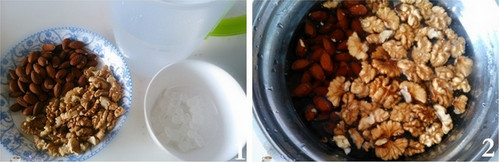 2、将杏仁和核桃仁用温水泡四个小时左右。