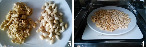 4、将去好皮的杏仁和核桃仁平铺在盘子中,放入微波炉高火三分钟,这时候一股很香的味道散发出来。
