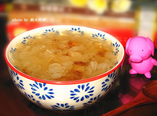 5、下桃胶和冰糖,煮至冰糖化开后即可食用。