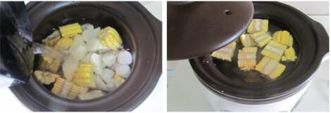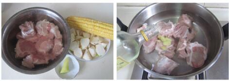 2、将棒骨、山药(如果不喜欢软糯,可以在中间的时候再将山药放入)和玉米、姜片一起放入煲中炖煮,加入适量的水,注意水要一次性加足。
