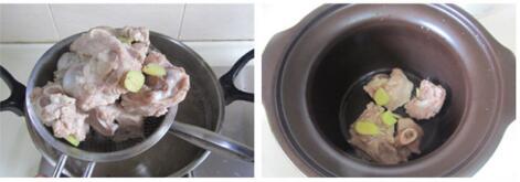 4、将焯煮过的棒骨放入煲中,加入几片姜。