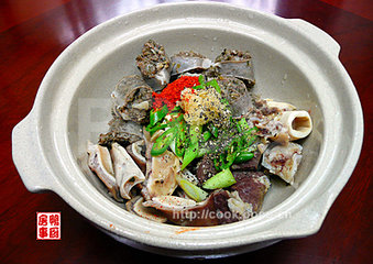 2、韩国血肠是小吃文化之一,通常在路边摊/帐篷车食肆贩卖,大概二十块人民币一份,现买现切,热呼呼的,另外附上少许内脏,如猪肝,猪肺,猪肚,猪心,黄喉(气管)等,蘸粗盐/辣椒粉食用。