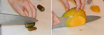 5、分别将腌黄瓜和芒果切成粒状后,加上青柠汁一起搅拌;