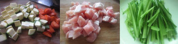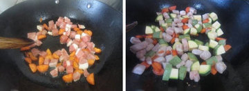 2. 油锅烧热先煸炒胡萝卜丁,然后下猪肉丁炒到5成熟,下西葫芦丁翻炒到5成熟。