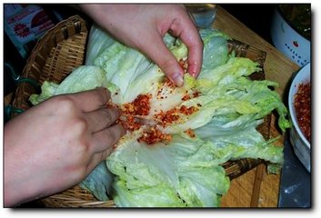 9、开始腌菜!从最内层开始,把调好的辣椒糊糊抹在白菜上,里外都抹。