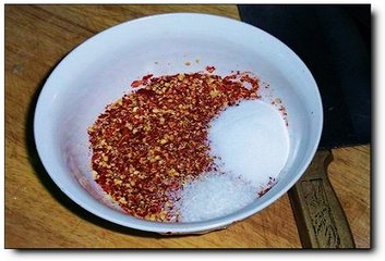 6、加入适量凉白开,把辣椒面、盐、味精调匀。