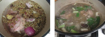 4、 特别要提出九层塔(也叫金不换,兰香),是罗勒的一种,但绝不是西式罗勒。九层塔的杆子是紫红色,叶子深绿略带披针形。西式罗勒浅绿叶子,绿杆子,叶子带卵圆形。顺便说一下,台湾三杯鸡用的是九层塔不是西式罗勒。青柠更香,最好不要用黄柠檬代替。还可以加入一些越南刺芹烫入汤中,更香。吃辣的朋友可以加入新鲜辣椒碎。