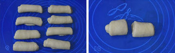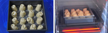 13、 将面卷4行 4例的排放在烤盘上,静置发酵约30分钟。