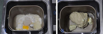 2、 加入室温软化黄油25克,再次开启面包机“和面”功能,运行两次15分钟,直至面团成光滑状,可拉出透明薄膜。