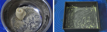 11、 小碗内放入白芝麻,将面卷的底部粘上白芝麻。