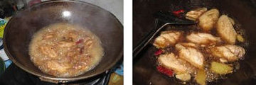 3、锅中留少许油,将姜块、葱段稍煸,下鸡翅,加盐、酱油、白糖、料酒及可口可乐。