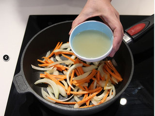 2.在平底锅内高火加热适量油,加入洋葱和红萝卜炒香,之后加入鸡汤煮滚。