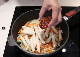 配料:红萝卜80g,洋葱半个,韩式辣椒2汤匙,油1汤匙,盐2g,鸡汤200ml。