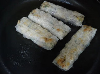 4、以半煎炸的方式,把春卷煎到酥脆 完成