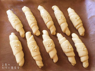 10、烤箱170度预热,奶油卷刷上蛋液,洒上杏仁粒