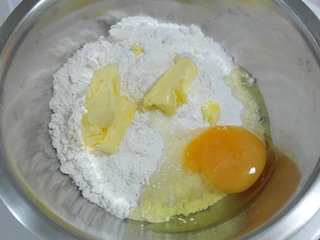 2、取一盆混和松饼粉.奶油和鸡蛋。